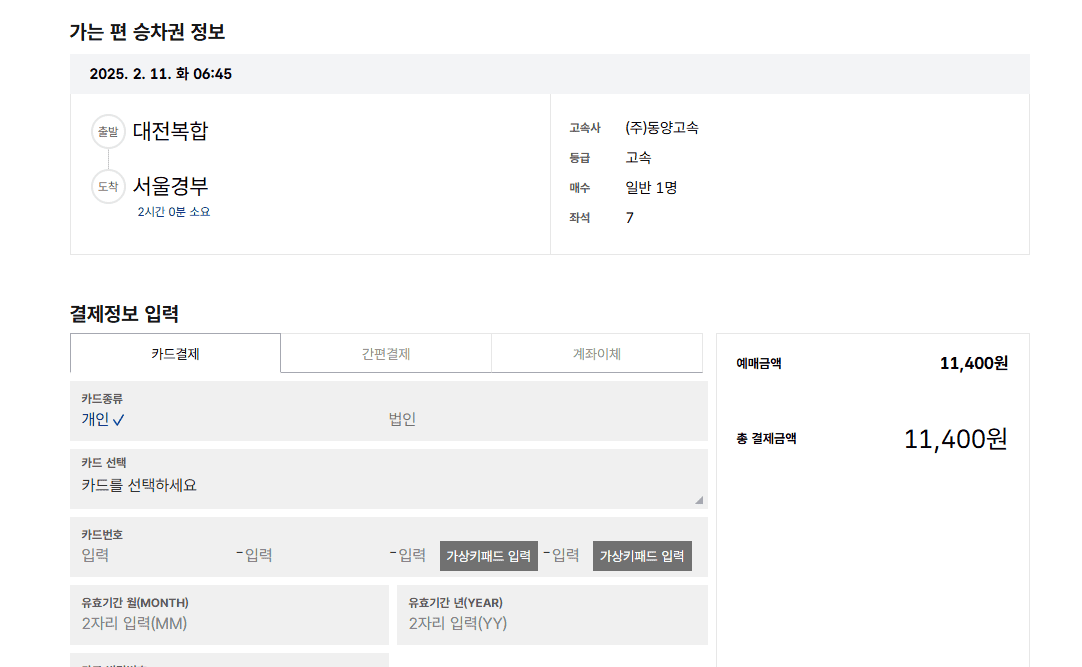 | 08:40 | 11:00 | 고속 | 14,800원 | 2시간 20분 |