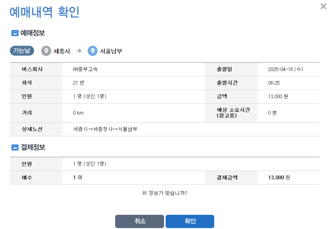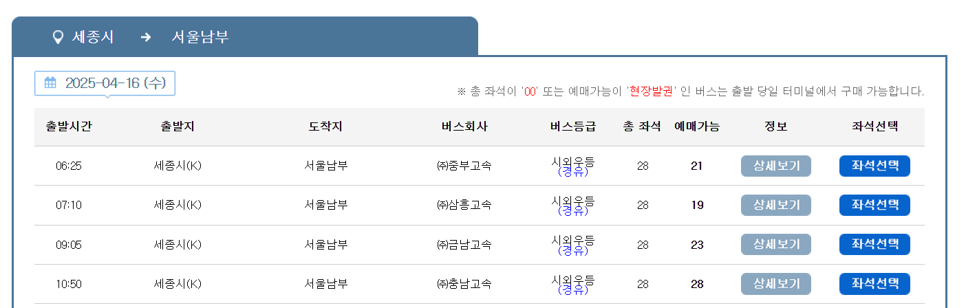 - 출발지 : 세종 와 도착지 : 원하는 도시를 입력합니다.