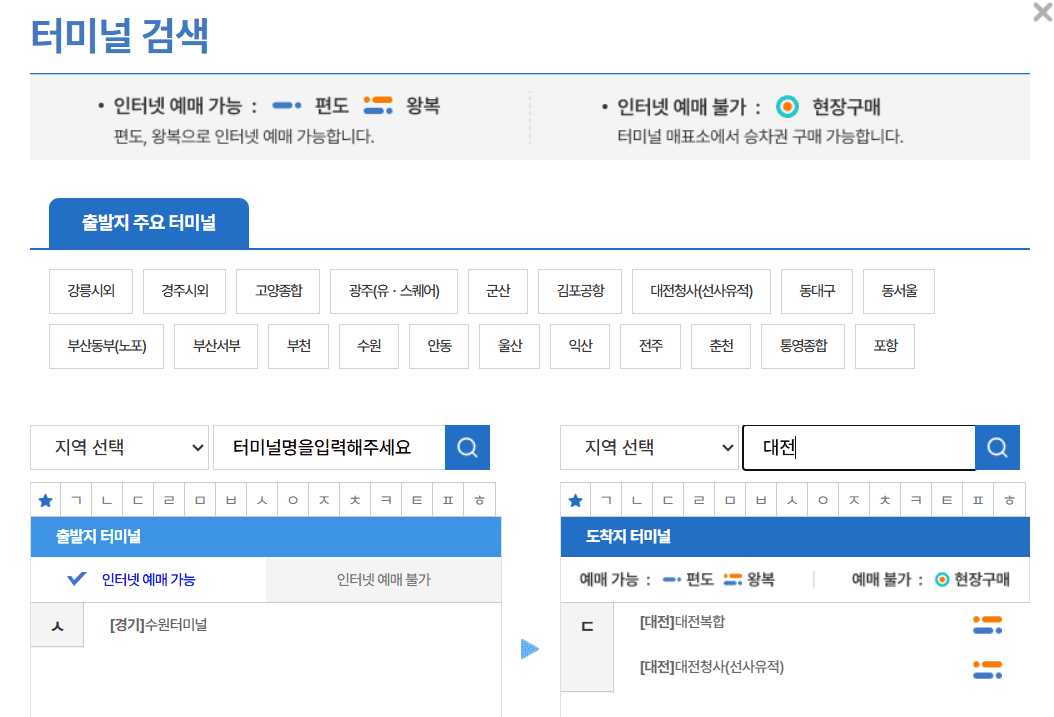2) 출발지 : 수원터미널, 도착지 : 원하는 지역을 선택합니다.