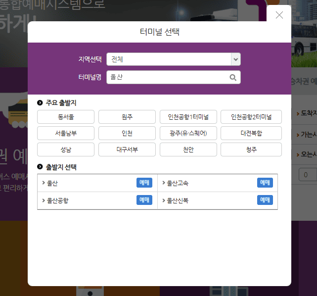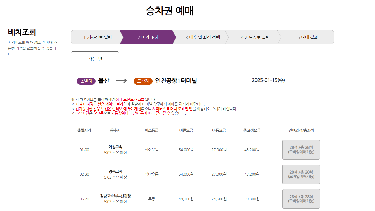 2. 출발지와 도착지 선택: 출발지로 '울산', 도착지로 '인천공항 T1' 또는 '인천공항 T2'를 선택합니다.