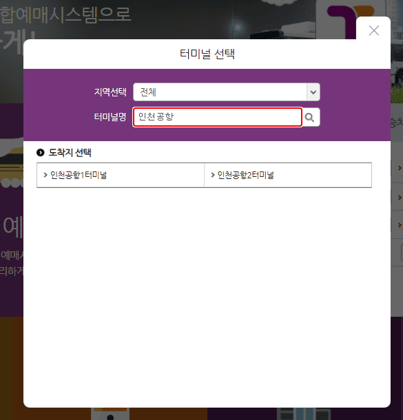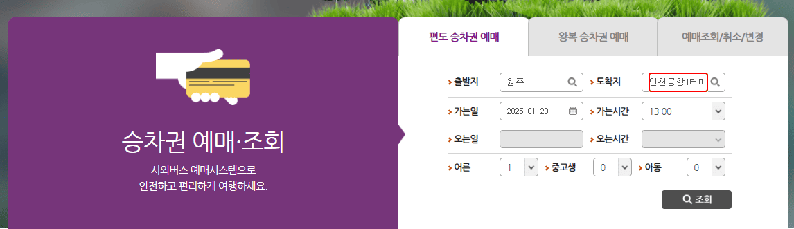 2. 출발지로 '원주'를, 도착지로 '인천공항 T1' 또는 '인천공항 T2'를 선택합니다.