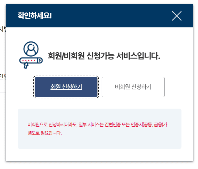 공인인증서, 휴대폰 인증 등을 통해 본인 인증 후 로그인합니다.