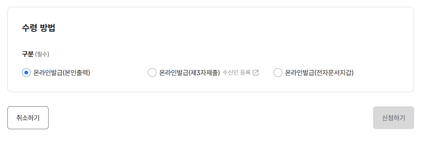 온라인 발급 (본인 출력), 전자문서지갑 발급, 제3자 제출 등 원하는 발급 방법을 선택합니다.