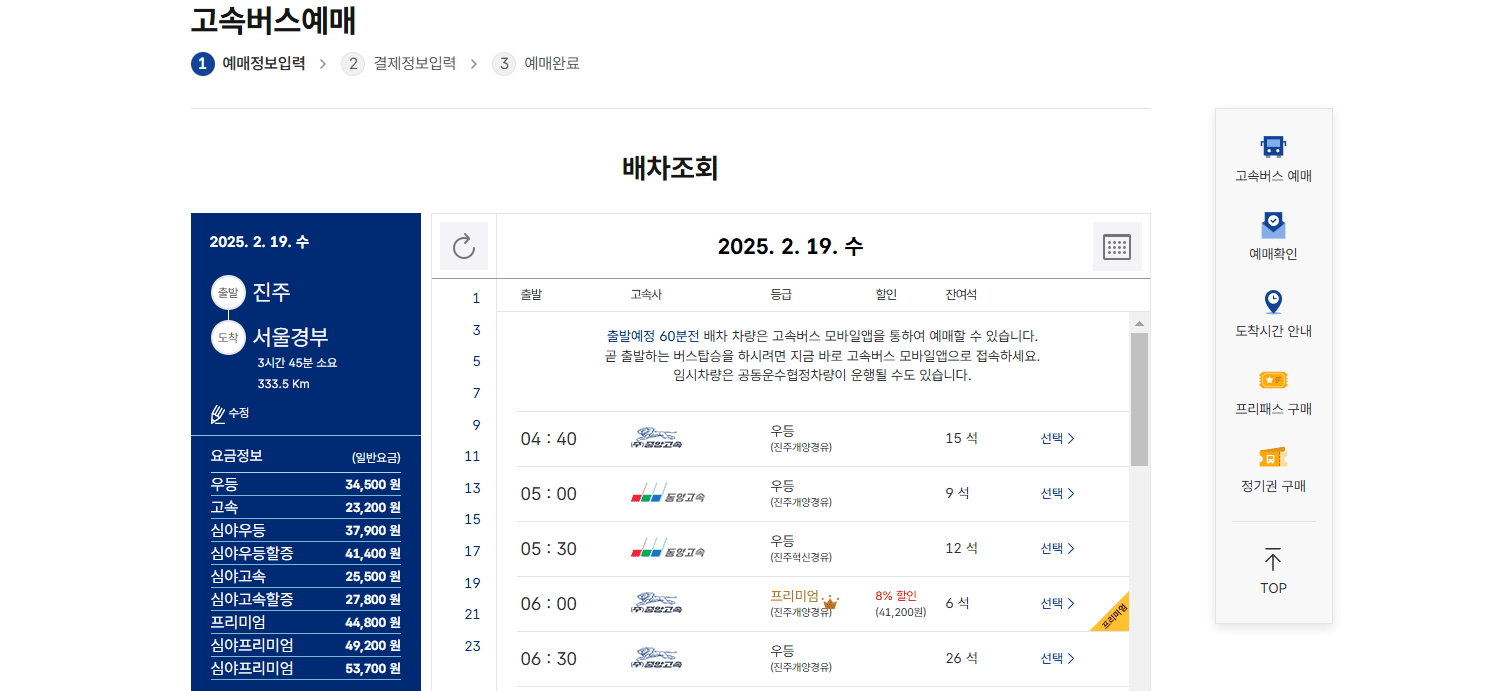 | 우등 | 06:30 | 10:40 | 4시간 10분 | 34,500원 |