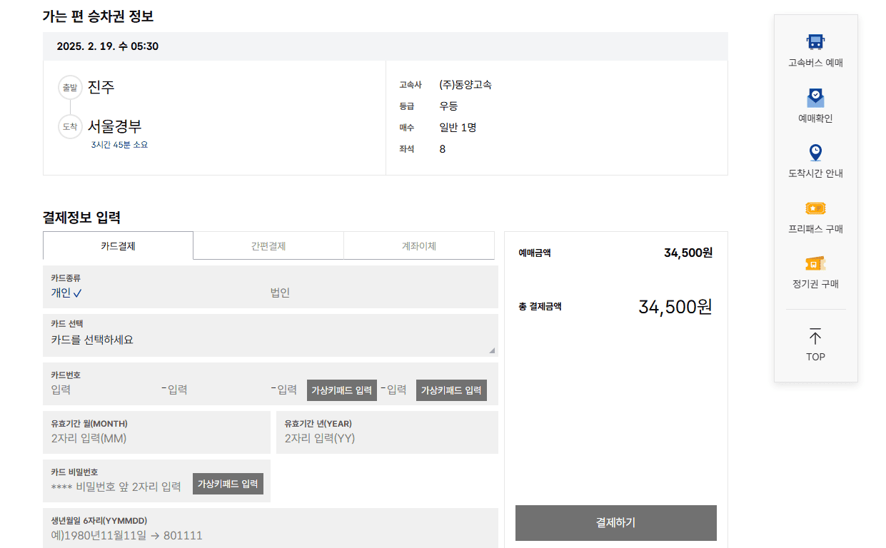 6. 예매 승차권 정보를 확인 후 결제를 진행합니다.