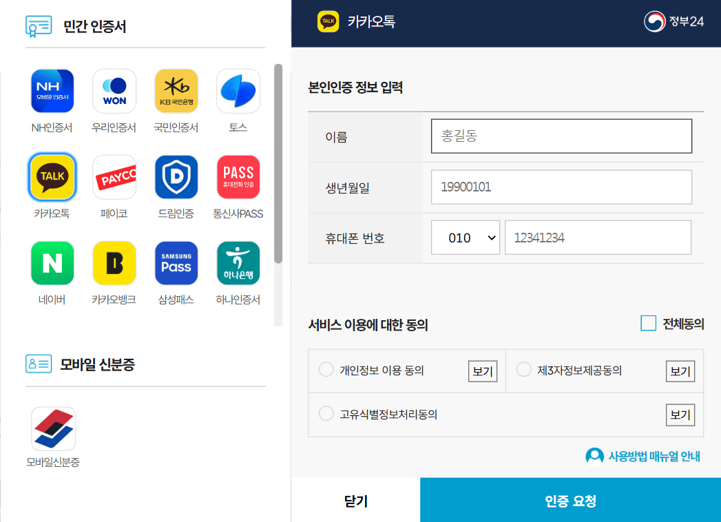 - 본인 인증: 공동인증서나 휴대폰 인증 등으로 본인 확인 절차를 거칩니다.