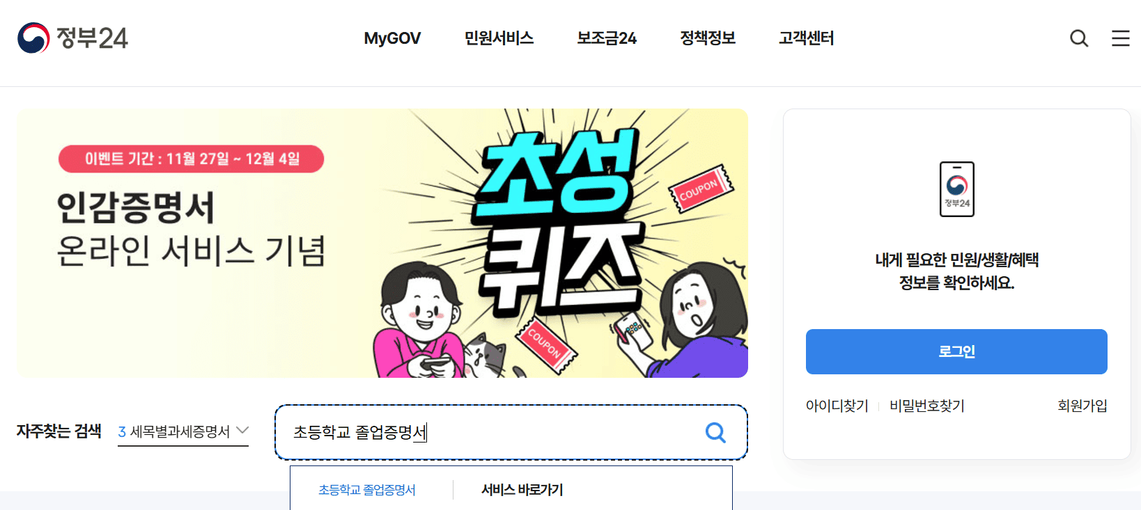 3. 서비스 검색: 상단 검색창에 '초등학교 졸업증명서'를 입력하고 검색합니다.